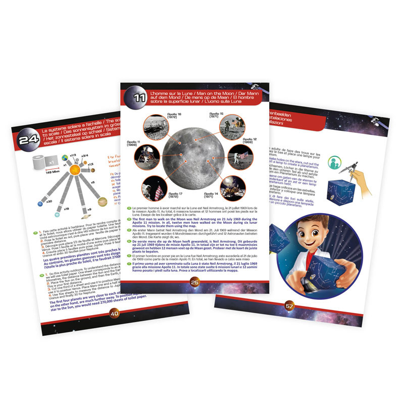 Ata mund të bëjnë pyetje dhe të zgjerojnë njohuritë e tyre për kozmosin. Ky set argëtues ofron 50 aktivitete për të eksploruar një sërë temash të tilla si: Njeriu dhe pushtimi i hënës; sistemi diellor në shkallë; yjësitë e ndryshme, etj.